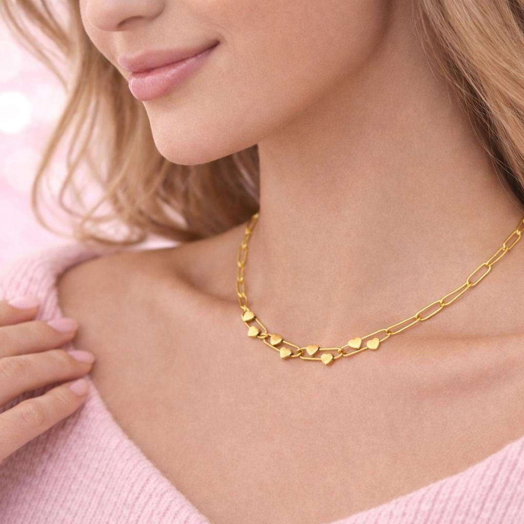 The paperclip-style links are finished with subtle heart charms, giving it a modern look with just the right touch of love.